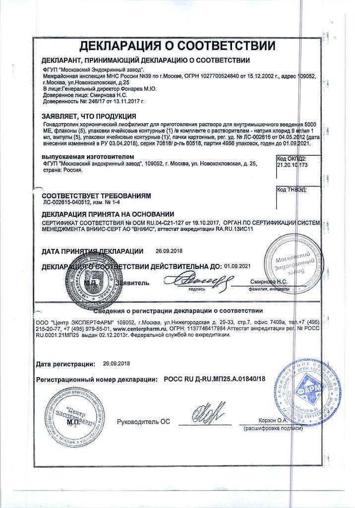 Основной компонент препарата обладает гонадотропным действием, в наибольшей степени – лютеинизирующим. Под его влиянием активно биосинтезируются половые гормоны в гонадах, стимулируя выход яйцеклеток из яичников и развитие сперматозоидов. Также под воздействием лекарственного средства лучше развиваются половые органы и формируются вторичные половые признаки.