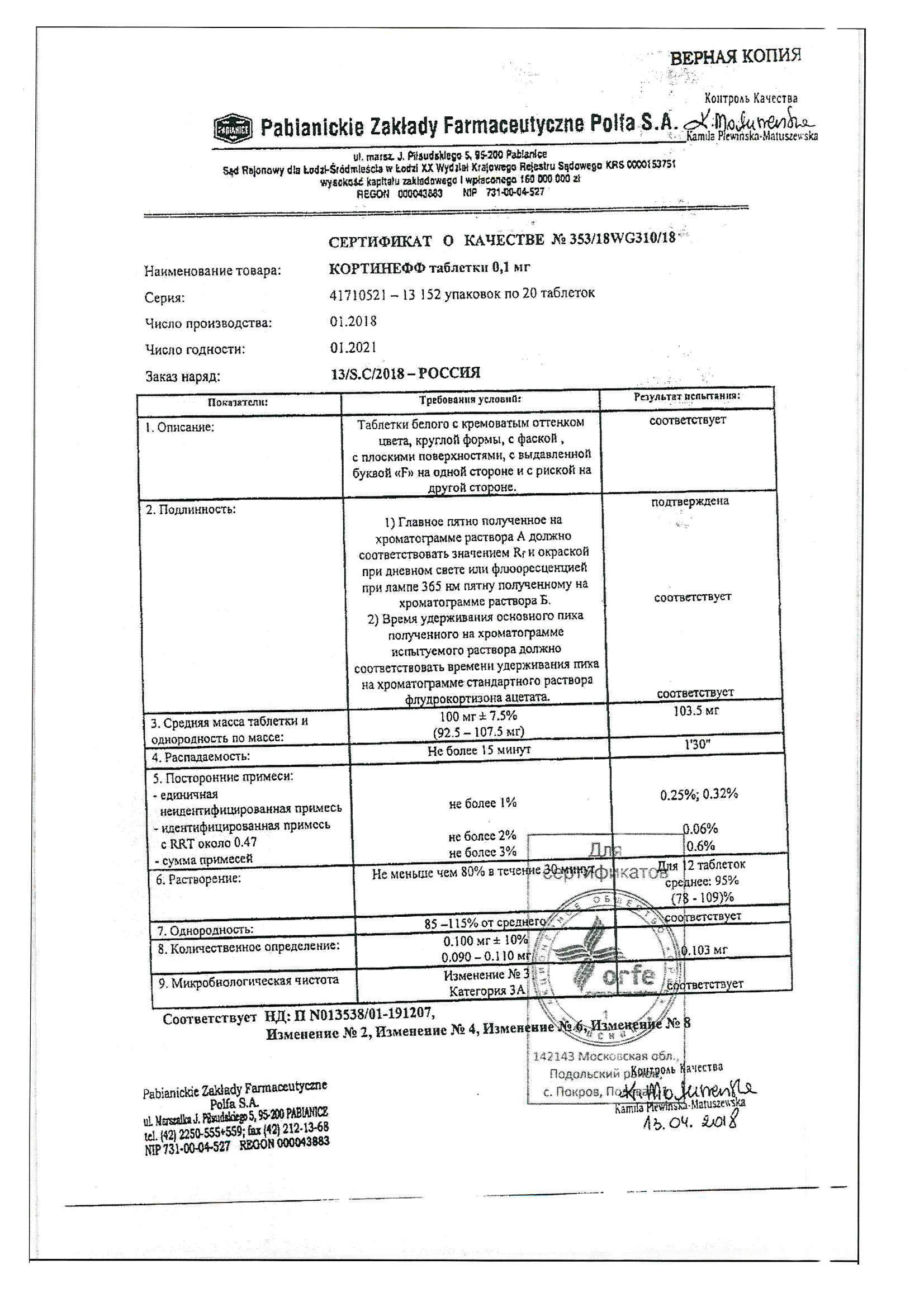 Активное вещество: флудрокортизона ацетат 100 мкг.
