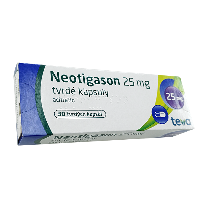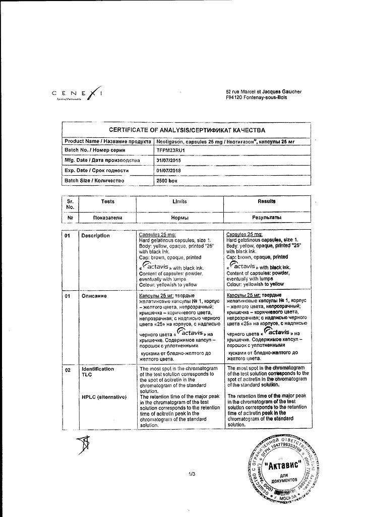 1 капсула Неотигазон 25 мг содержит активное вещество: ацитретин 25 мг, (в виде сухого спрея, содержащего 25 % активного вещества).