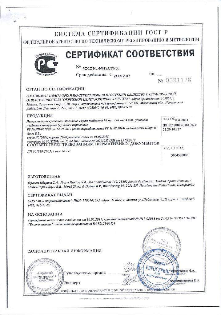 Фосаванс - бисфосфонат, ингибирующий резорбцию костной ткани. Активное вещество алендроновая кислота локализуется в зоне активной резорбции, где и производит свое действие, не оказывая существенного влияния на образование новой ткани. Подавление резорбции снижает образование новой, но в меньшей степени, что влечет прогрессирующее увеличение костной массы. Алендронат встраивается в матрикс вновь формирующейся костной ткани, в терапевтических дозах не вызывает остеомаляцию. Витамин D3 (колекальциферол) продуцируется в коже, при отсутствии солнечного света его выработка снижается, поэтому необходимое количество должно поступать с пищей. Витамин усиливает абсорбцию кальция и фосфатов в кишечнике, регулирует уровень кальция в крови, необходим для формирования костной ткани. Его недостаточность вызывает потерю костной массы и риск переломов при остеопорозе.