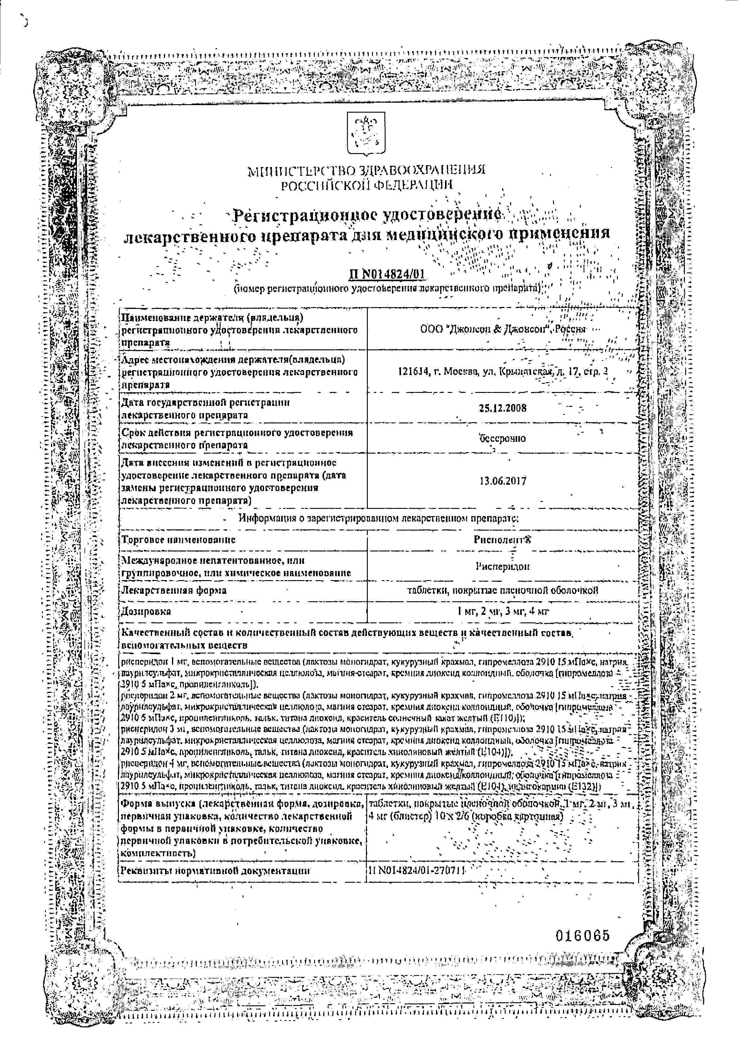 Пациенты с массой тела 50 кг и более. Рекомендованная начальная доза препарата — 0,5 мг 1 раз в сутки. При необходимости эта доза может быть повышена на 0,5 мг/сут не чаще чем через день. Для большинства пациентов оптимальной дозой является доза 1 мг/сут. Однако для некоторых пациентов предпочтительней прием по 0,5 мг/сут, тогда как некоторым требуется увеличение дозы до 1,5 мг/сут. При необходимости применения дозы 0,5 мг рекомендуется назначать препарат Рисполепт®, раствор для приема внутрь.