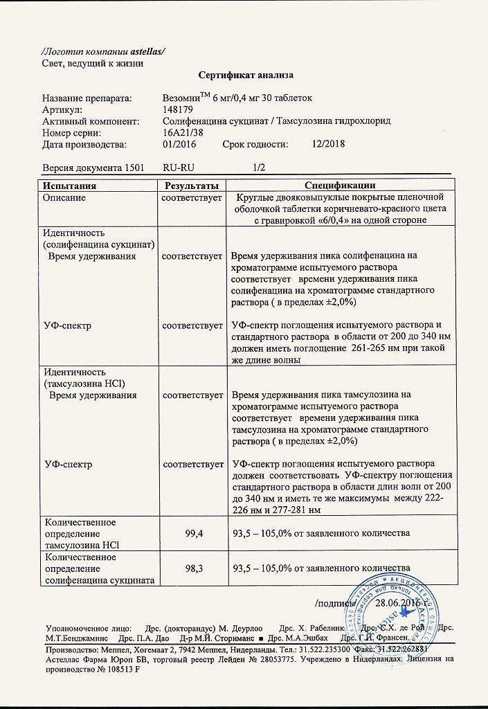 * каждая двухслойная таблетка содержит один слой солифенацина сукцината (6 мг) и один слой тамсулозина гидрохлорида (0,4 мг).