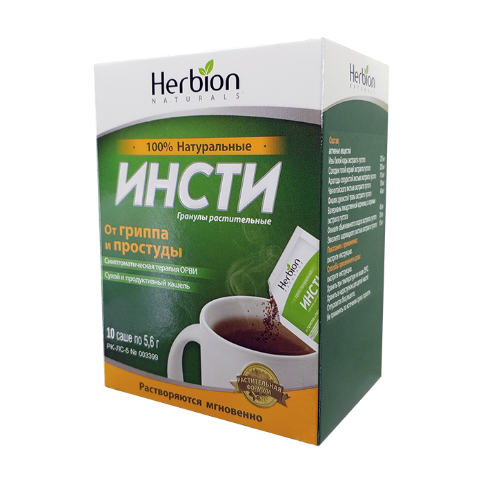 Инсти - фитопрепарат, применяемый при простудных заболеваниях. Оказывает отхаркивающее, противовоспалительное, муколитическое, а также жаропонижающее действие. Обладает седативным, потогонным, мочегонным, бактерицидным, противовирусным эффектами. Препарат усиливает образование мокроты, способствует ее разжижению и отхождению.