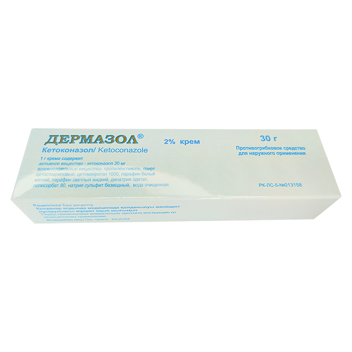 Дермазол – противогрибковый препарат широкого спектра действия, применяемый для местного и системного лечения микозов. Препарат содержит активное вещество - кетоконазол – синтетическое производное имидазолдиаксолана. Кетоконазол оказывает фунгицидное и фунгистатическое действие в отношении дерматофитов, эумицетов, диморфных и дрожжевых грибов. Отмечена также противомикробная активность кетоконазола в отношении большинства штаммов стафилококков и стрептококков. Препарат после проникновения в клетку гриба способен угнетать процессы синтеза веществ, которые являются основой клеточной мембраны гриба, так кетоконазол приводит к нарушению биосинтеза триглицеридов, фосфолипидов и эргостерина. Вследствие уменьшения количества этих веществ в клетке гриба и непосредственно клеточной мембране происходят необратимые изменения структуры клеточной оболочки. Фунгистатическое действие кетоконазола заключается в снижении способности грибов к образованию колоний. Фунгицидное действие препарата основано на изменении структуры и снижении прочности клеточной мембраны гриба, что приводит к её перфорации и гибели гриба.