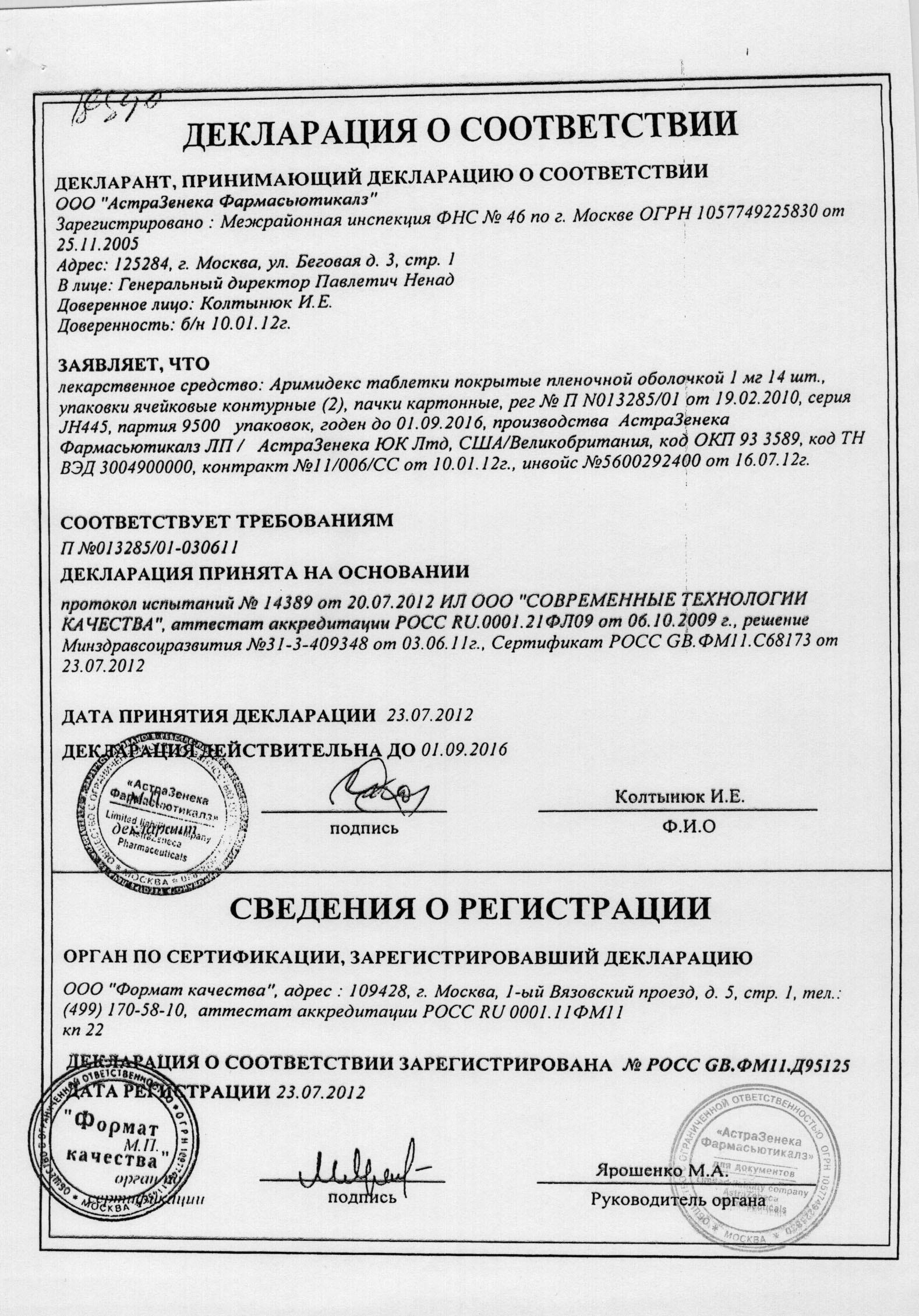 Применение. Таблетки Аримидекс принимают внутрь в одно и то же время. Взрослым (включая пожилых) — по 1 мг 1 раз в сутки (длительное время). При появлении признаков прогрессирования заболевания прием препарата Arimidex следует прекратить. В качестве адъювантной терапии рекомендуемая продолжительность лечения — 5 лет.