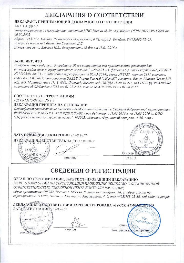 Противопоказания. Epirubicin нельзя назначать больным при выраженном угнетении миелоидного ростка кроветворения, посе проведенной ранее терапии даунорубицином, доксорубицином в кумулятивных дозах, при сердечной недостаточности. Также препарат противопоказан беременным и кормящим женщинам, детям до 18 лет и пациентам с гиперчувствительностью к препарату.