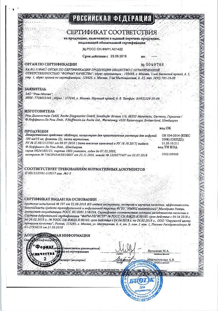 Первую дозу препарата Мабтера® (375 мг/м2) пациенты должны получить в виде в/в инфузии препарата в лекарственной форме концентрат для приготовления раствора для инфузии. Для в/в введения следует использовать препарат Мабтера® в лекарственной форме концентрат для приготовления раствора для инфузий (см. соответствующую инструкцию по медицинскому применению).