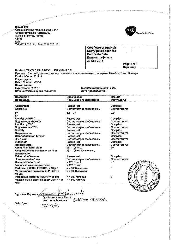 Раствор Зантак вводится в/в не быстрее, чем 2 мин/амп., после предварительного разведения. Дозировка для введения – 50 мг. Необходимое количество раствора разводится в 20 мл растворителя, который совместим с ранитидином. Введение следует проводить каждые 6–8 часов. Интермиттирующую инфузию проводят в течение 120 минут. Повторные инфузии проводят каждые 6–8 часов по 50 мг.